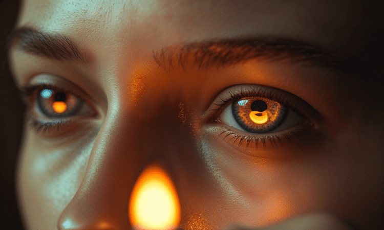 Weary eyes reflecting candlelight symbolizing symptoms of spiritual fatigue.